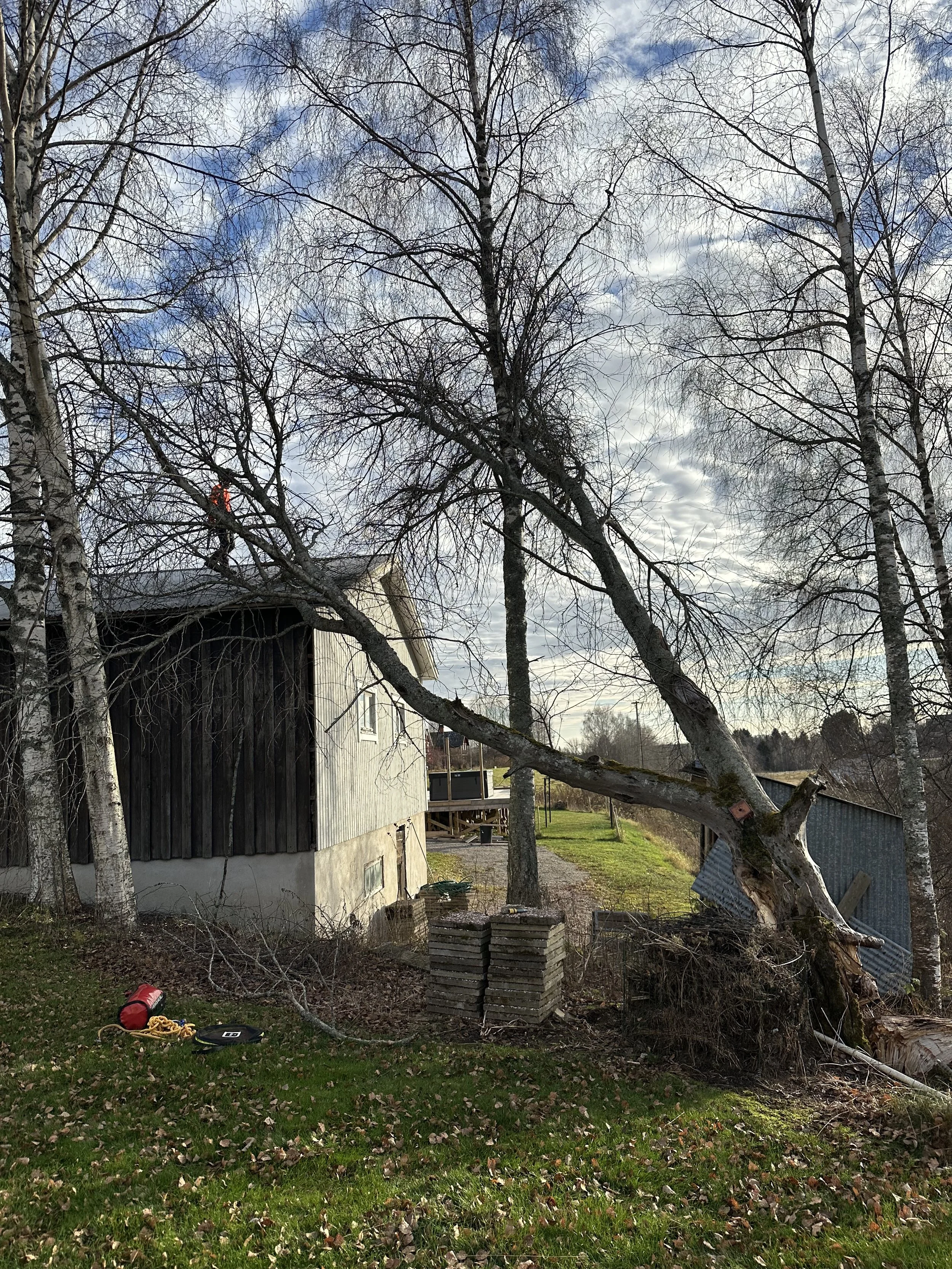 Går inte träden att fälla från marken? Inga problem då klättrar vi upp och tar ner träden i sektioner.